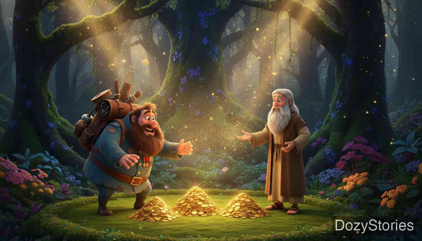 接着他们上路了,当来到一片森林时,圣彼得对快乐老兄说:“现在,我们要分金子了。”——“好,”他回答,“我们就分吧。”于是圣彼得把金子分成了三堆。快乐老兄心想:“他脑子里现在又有什么疯狂的念头?他分成了三份,可我们只有两个人!”但圣彼得说:“我分得很精确;一份给我,一份给你,还有一份给那个吃了羊心的人。”