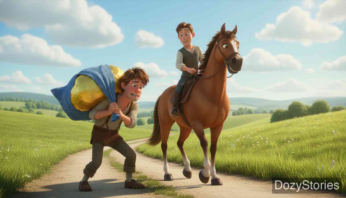 汉斯用七年的工钱换来一块头一般大的金子。但在回家的路上,他觉得背负重物太辛苦,便羡慕起一位骑马的人,于是天真地用金块换了对方的马。