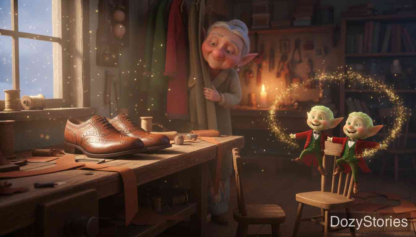 贫穷的鞋匠在桌上留下最后一份皮革,清晨醒来却发现鞋子已奇迹般缝制完成。