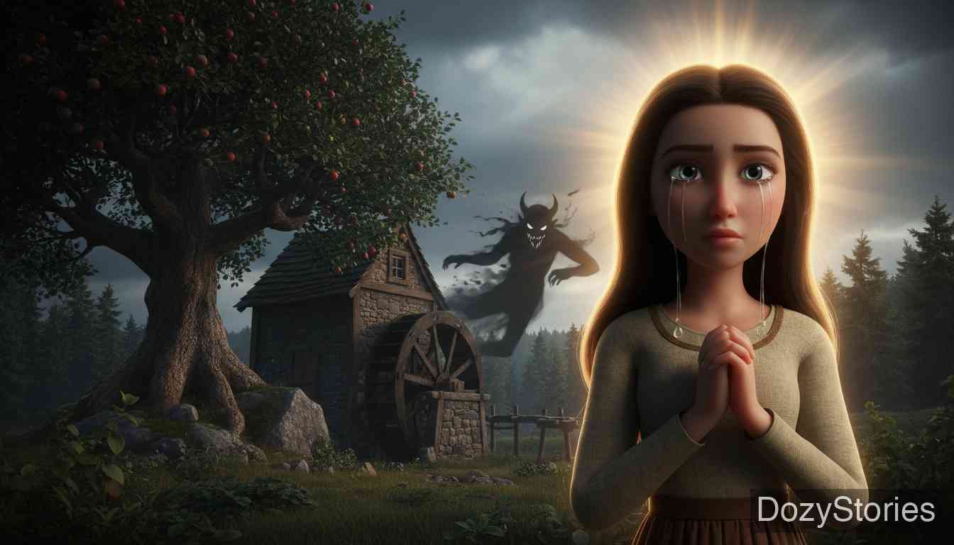 从前有个磨坊主,家境渐渐败落,最后除了磨坊和后面的一棵大苹果树外一无所有。一天,他去森林里砍柴,一个从未见过的老人走上前来对他说:‘你何必这么辛苦砍柴呢?只要你答应把磨坊后面站着的东西给我,我就让你发大财。’磨坊主想:‘除了那棵苹果树,还能有什么呢?’于是便答应了,并给那陌生人写了字据。陌生人嘲笑着说:‘三年后,我来取走属于我的东西。’当磨坊主回到家,妻子惊奇地发现家里突然堆满了财宝。磨坊主解释了事情经过,妻子惊恐地喊道:‘那一定是魔鬼!他指的不是苹果树,而是我们的女儿,她当时正站在磨坊后面扫地。’
