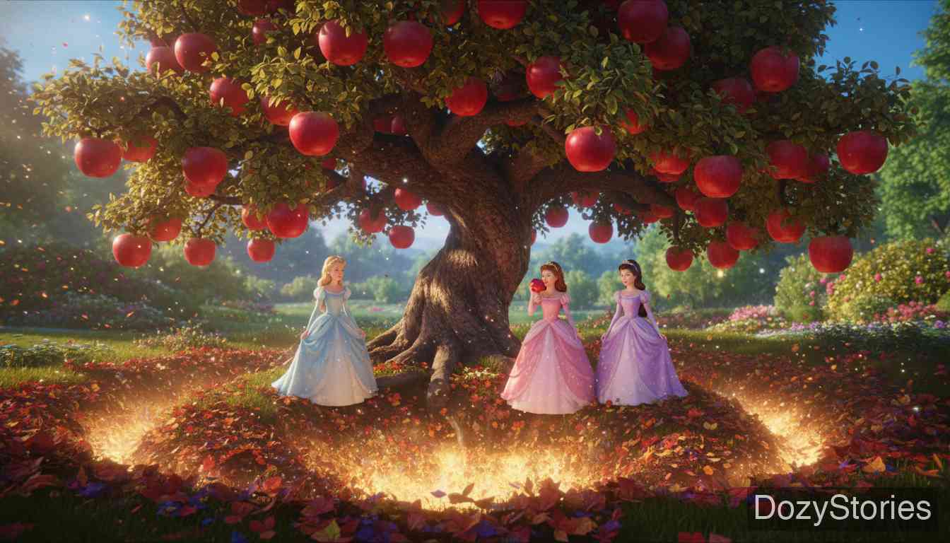 国王深爱一棵苹果树,诅咒任何摘苹果的人沉入地下。三位公主因好奇摘了苹果吃,结果真的消失在地下深处。