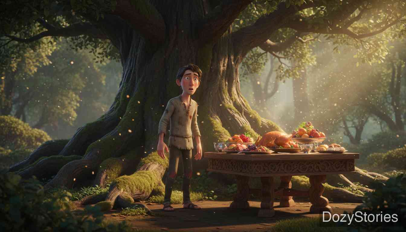 当他下到地面时,惊讶地发现树下摆着一张桌子,上面铺满了食物,香气扑鼻而来。“这一次,”他说,“我的愿望在最关键的时刻实现了。”他不问是谁送来的食物,也不问是谁做的,走到桌前尽情享用,直到吃饱为止。