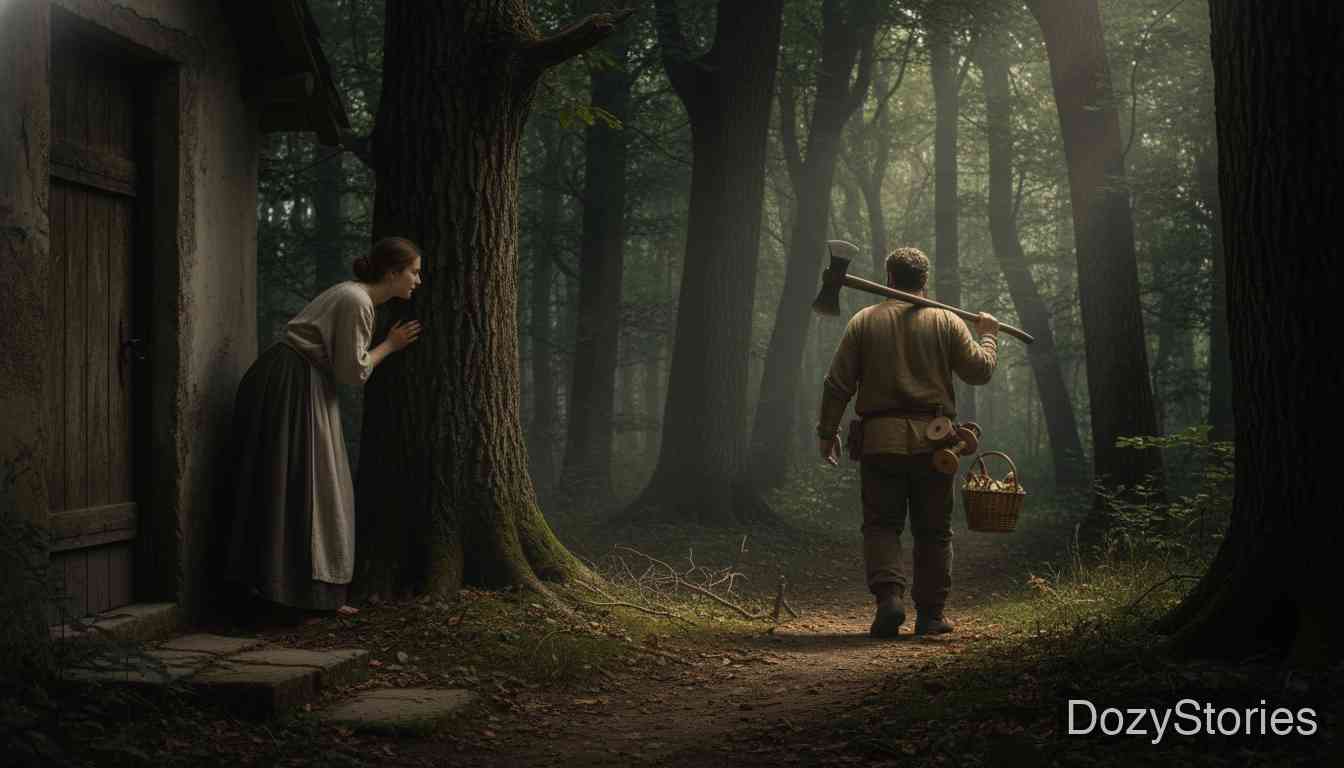 一个极其懒惰的妻子不愿纺纱,当丈夫要进森林砍木头做绕线轴时,她为了逃避工作,偷偷尾随丈夫进入了森林。