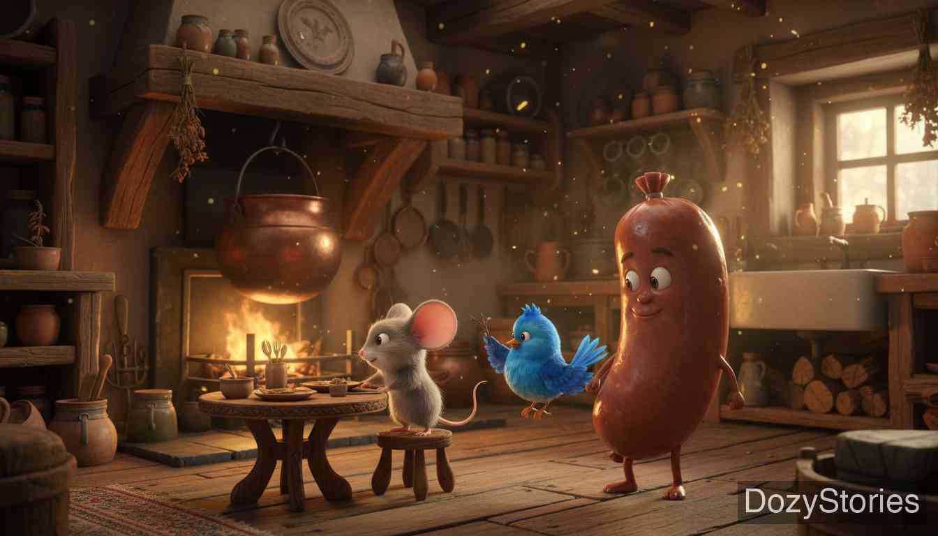 很久以前,一只老鼠、一只小鸟和一根香肠成了合伙人。他们共同操持家务,在很长一段时间里,他们过着和平且富足的生活,积累了许多财产。小鸟的任务是每天飞进森林里衔木头。老鼠负责提水、生火和摆放餐具。香肠则负责煮饭。