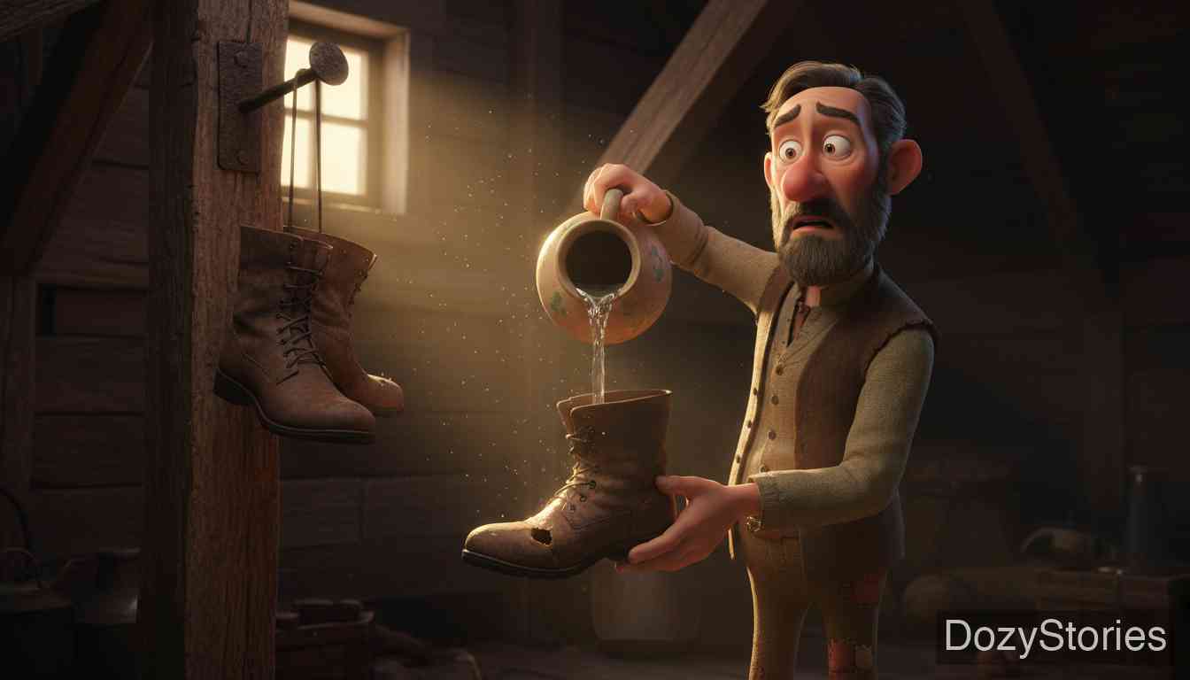 小姑娘回到家里,把这番话告诉了父亲。男人说道:“我该怎么办呢?结婚是喜事,也是痛苦。”他拿不定主意,最后脱下一只靴子说:“拿着这只靴子,鞋底上有个洞。把它拿到阁楼上去,挂在大钉子上,然后往里灌水。如果它能盛住水,我就再娶个妻子;如果水漏光了,那我就不娶。”