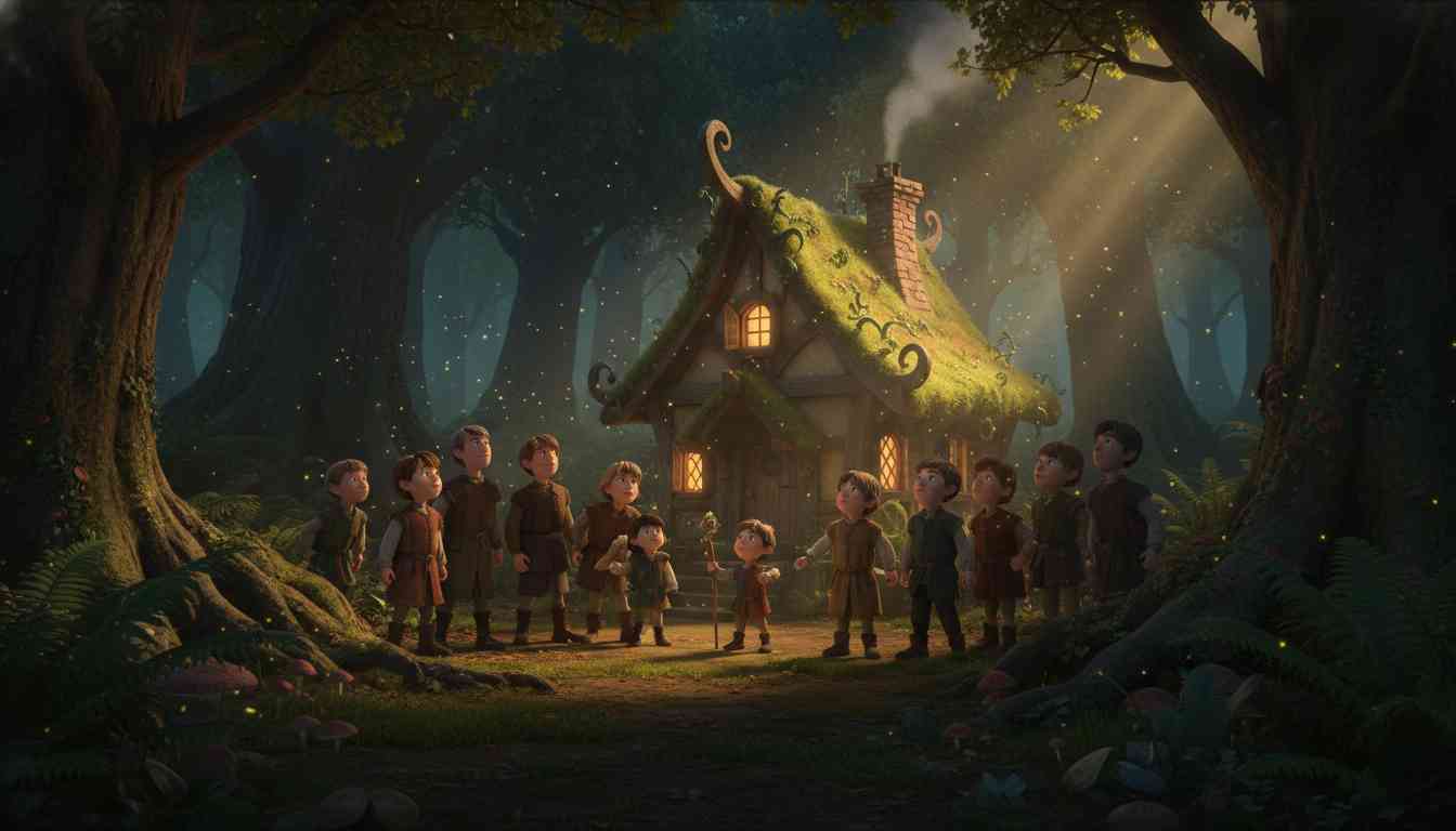 于是他们走进森林深处,在最黑暗的地方,发现了一座空着的小魔法屋。他们便说:“我们就住在这里,本杰明,你是最小最弱的,你留下来看家,我们其他人出去找食物。”